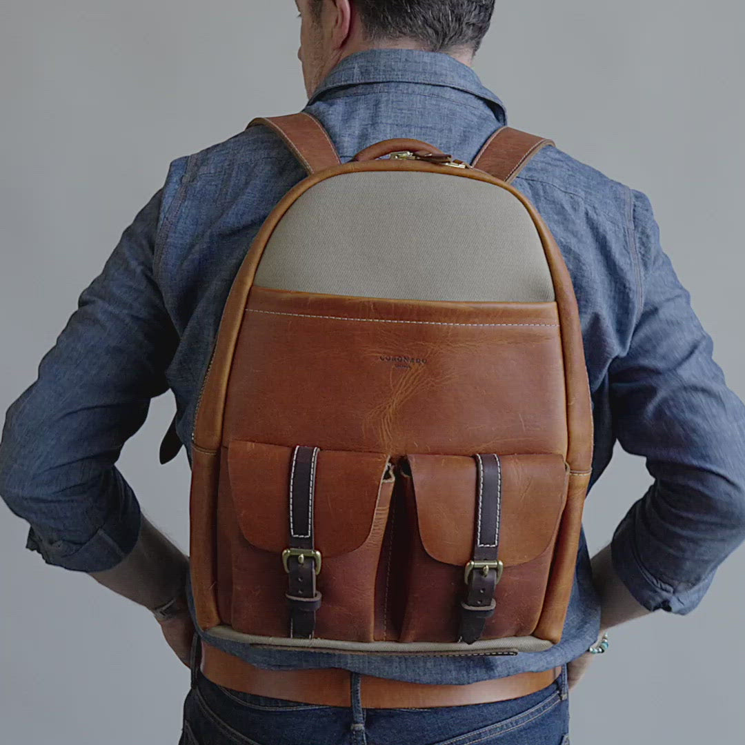 The Grand Slam Backpack No.130 is a classic shape with great functionality. Designed with an extra-wide top opening that zips 27" around, two front gusset pockets, and a large front open pocket. The leather is relatively light-weight and the cotton canvas mixed in takes some weight off the bag. The inside includes an inside zipper pocket, laptop divider and fabric utility pockets.