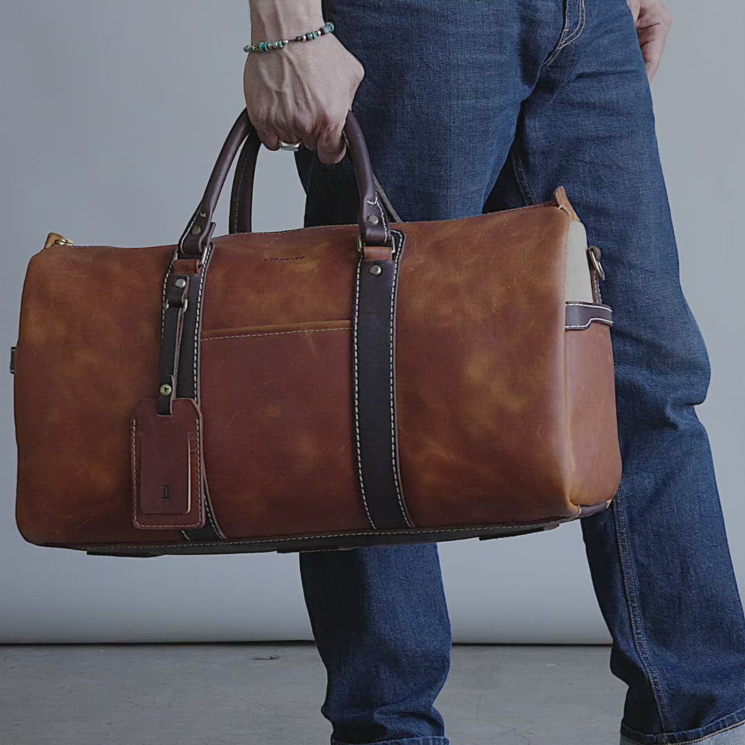 The Grand Slam Duffel No.140 is our newest full-size duffel bag with the capacity to carry big. The images displayed are packed with (5) pants, (5) shirts, (5) t-shirts, socks and several underwear and a little space to spare. The leather is relatively light-weight and the cotton canvas mixed in takes some weight off the bag.
